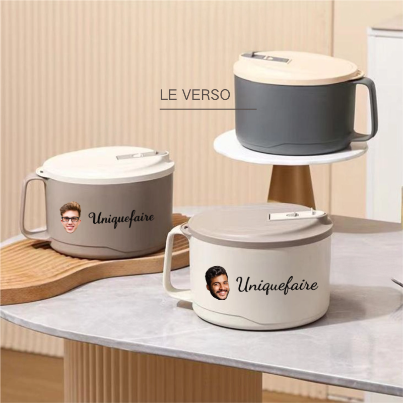Ces bols à nouilles sont conçus sous forme de bol rond avec une poignée, ce qui permet une prise en main facile. Le couvercle s'ajuste parfaitement sur le bol, avec un élément de fermeture pour assurer l'étanchéité. Ils sont disponibles en différentes couleurs, telles que le brun, le bleu brumeux et le blanc, offrant des options pour répondre aux goûts des utilisateurs. De plus, ils peuvent être personnalisés par gravure, ajoutant une touche unique.