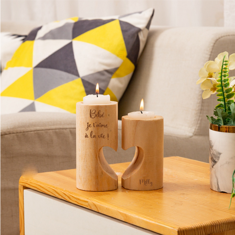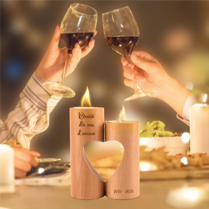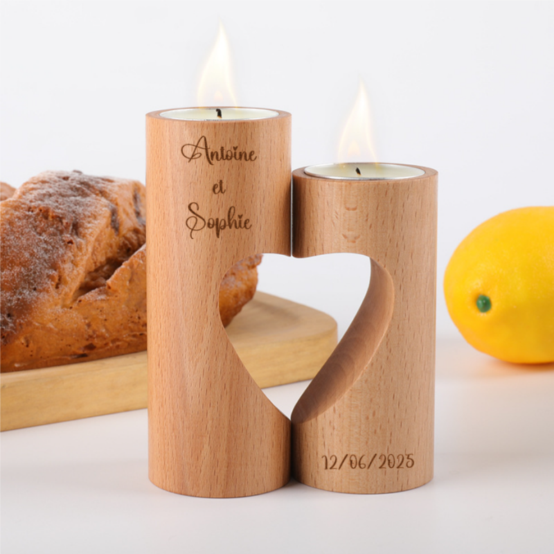 Ce bougeoir romantique se compose de deux cylindres en bois qui, lorsqu’ils sont placés côte à côte, forment un cœur évidé au centre. C'est un symbole parfait d’amour et d’unité. Il peut être personnalisé avec un prénom, une date ou un court message, gravés avec soin sur le bois pour un rendu à la fois naturel et touchant.