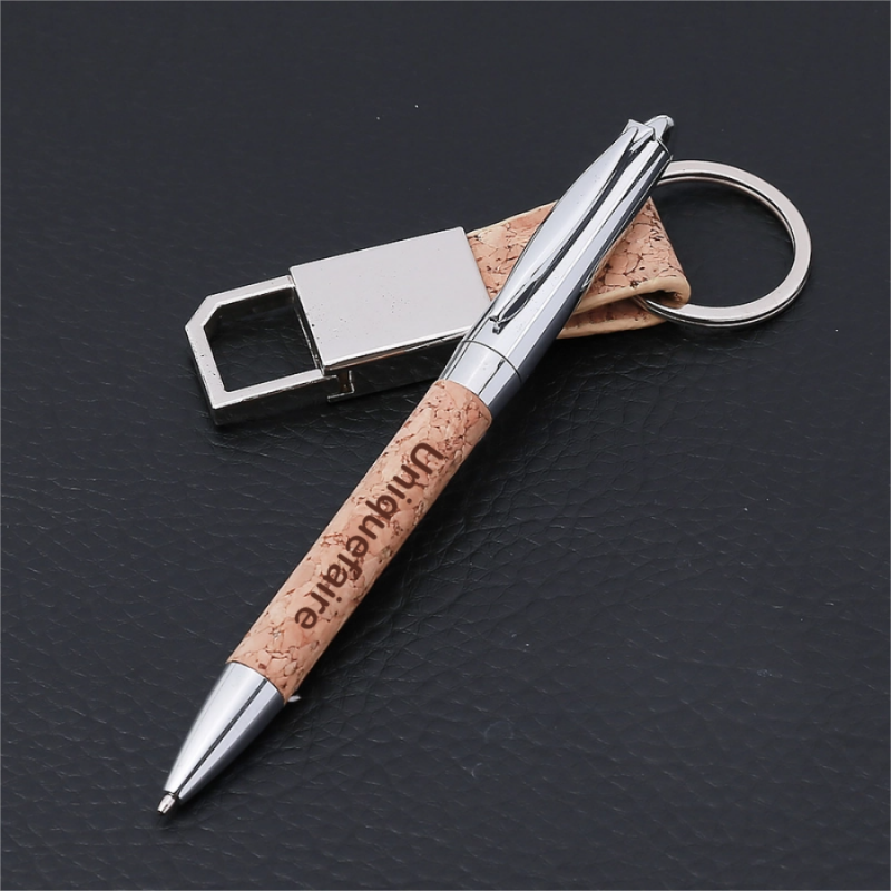 Ce coffret cadeau est soigneusement conçu avec une esthétique naturelle et professionnelle. Il comprend un carnet, un stylo à bille et un porte-clé, tous assortis avec un revêtement en liège et des finitions métalliques élégantes. Le design met en valeur la personnalisation possible avec des motifs comme des monuments, logos ou messages personnalisés, ce qui en fait un cadeau unique et symbolique.