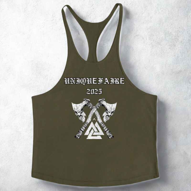 Ce débardeur a un design audacieux et puissant : deux haches croisées ornées de crânes sur fond de triangle stylisé, surmontées du texte en typographie gothique. Le texte peut être personnalisé, pour inclure un prénom, une date ou un mot symbolique.
