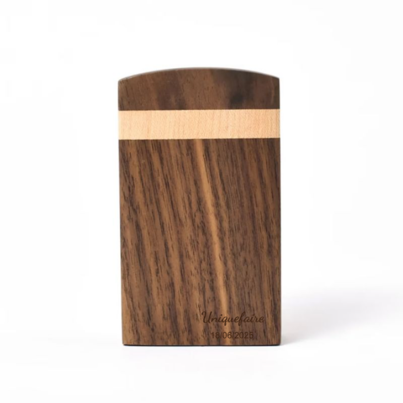 L'étui est fabriqué en bois de noyer naturel, apprécié pour sa solidité, sa densité et ses veines élégantes, avec une bordure en bambou clair pour un contraste raffiné.