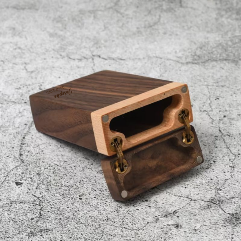 Cet étui à cigarettes au style vintage se distingue par ses lignes épurées et anguleuses, avec une ouverture basculante fixée par des charnières métalliques discrètes. Son design original mêle élégance et praticité, permettant un accès rapide aux cigarettes tout en les gardant en sécurité. Le contraste de couleurs entre le bois foncé et le bord clair renforce son caractère artisanal et sophistiqué.