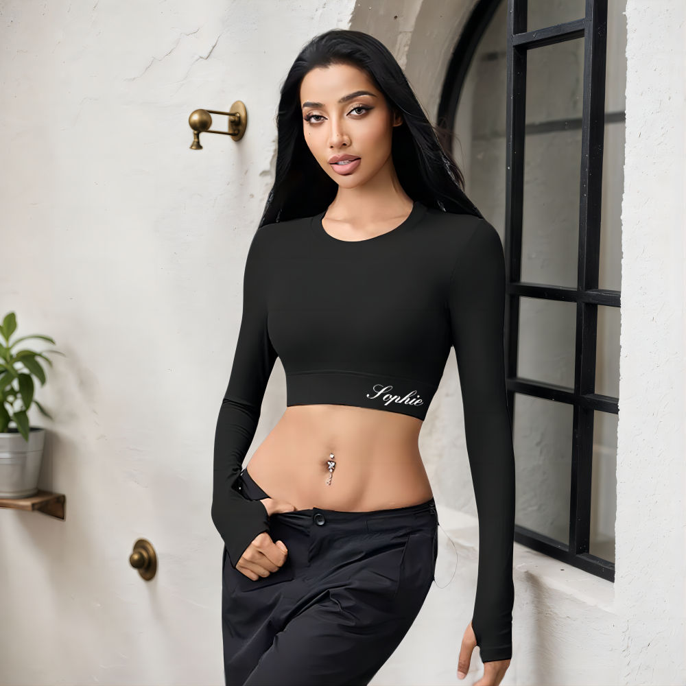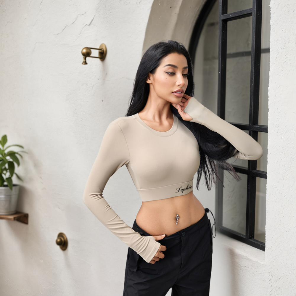 Ce T - shirt de sport pour femme a un design sexy et pratique. Il est moulant, avec des manches longues et un décolleté rond. La partie basse est courte, mettant en valeur le ventre. Le design en maille respirante et la découpe à la nuque ajoutent une touche de mode et de confort. Il peut être personnalisé avec un nom imprimé.