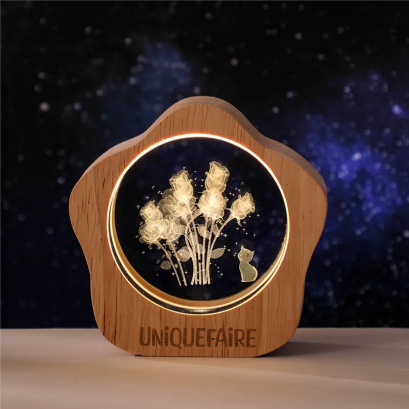 - Apportez une touche magique à votre intérieur avec cette lampe de nuit au design unique. Son cadre en bois de haute qualité en forme de nuage soutient un cristal gravé en 3D représentant des motifs romantiques, éclairé par une lumière LED douce et chaleureuse.