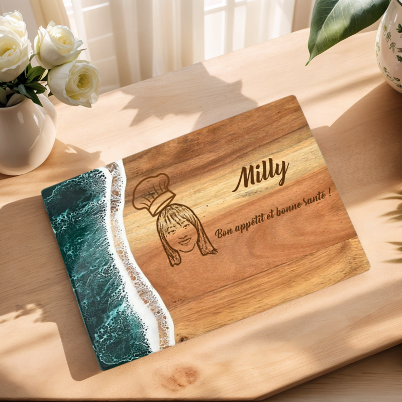 - Design : La combinaison du bois naturel et de l'effet de mer apporte un design moderne et chic, qui s'adapte facilement à tous types de cuisines ou comme cadeau personnalisé.