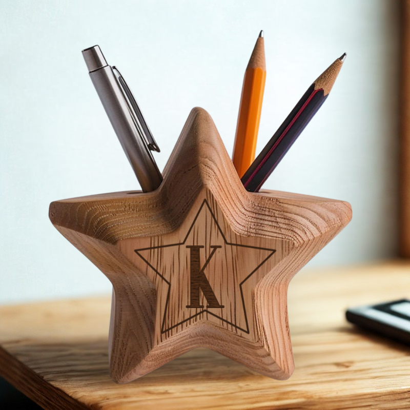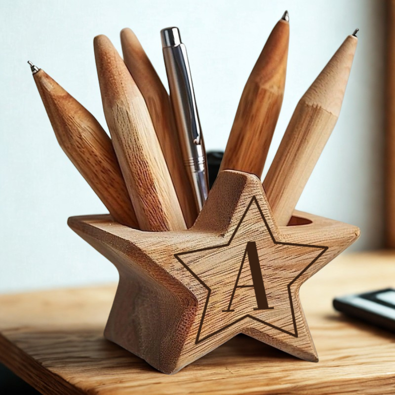 Pot à Crayons en Bois en Forme d’Étoile – Porte - stylos Personnalisable avec Initial