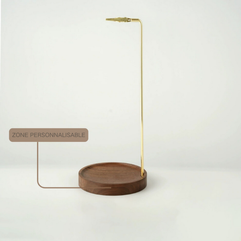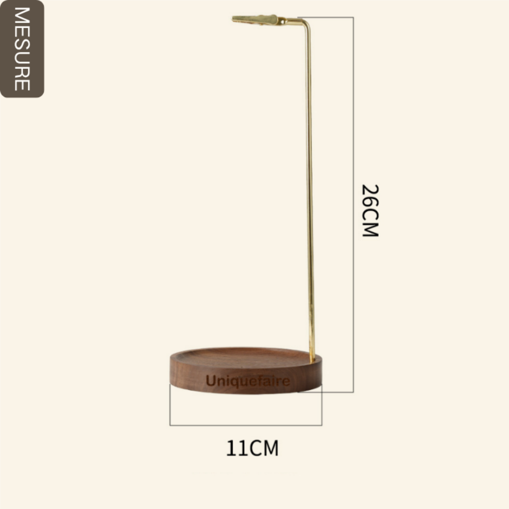 Ce support à bâtons d'encens est composé d'un socle rond en bois de noyer et d'un bras métallique en laiton de couleur dorée. Le bras est conçu pour maintenir le bâton d'encens en position suspendue. La structure simple et élégante en fait un accessoire de décoration pour n'importe quelle pièce.